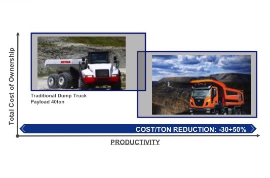 Von 30 bis 50% geringere Kosten pro Tonne als bei einem herkömmlichen Muldenkipper.